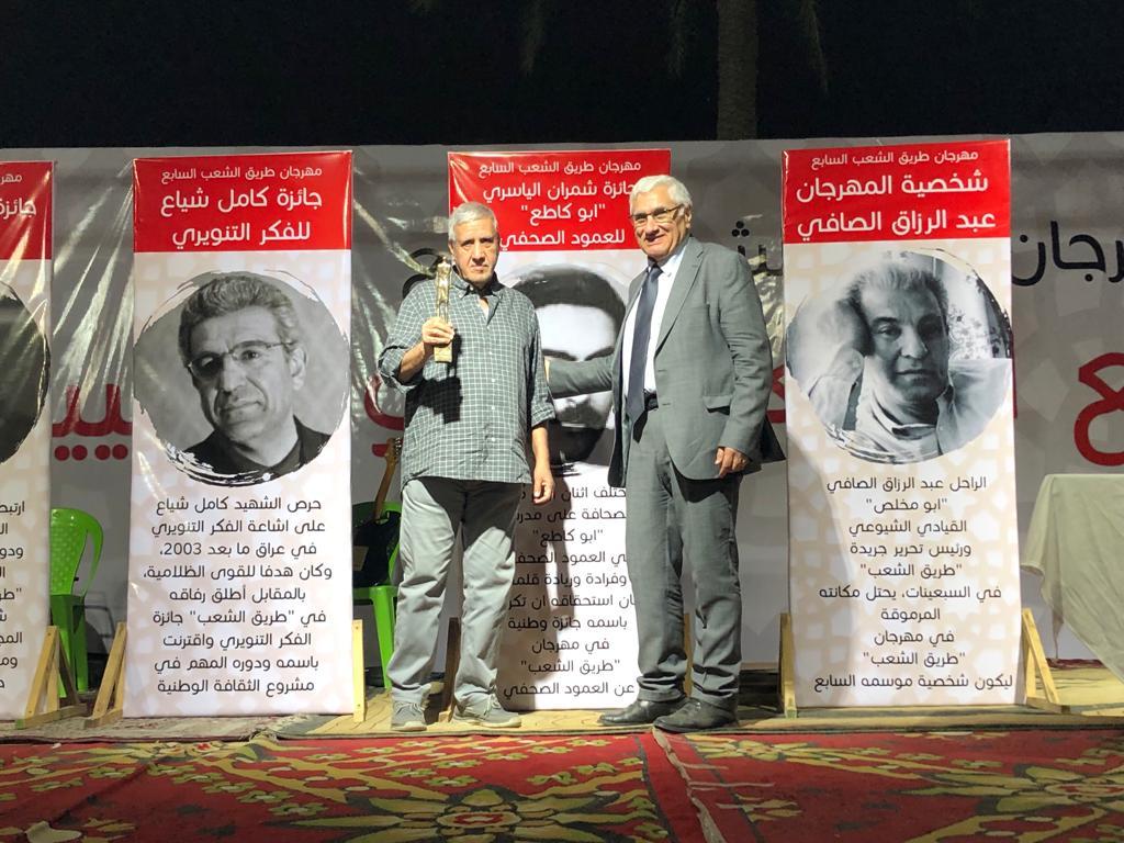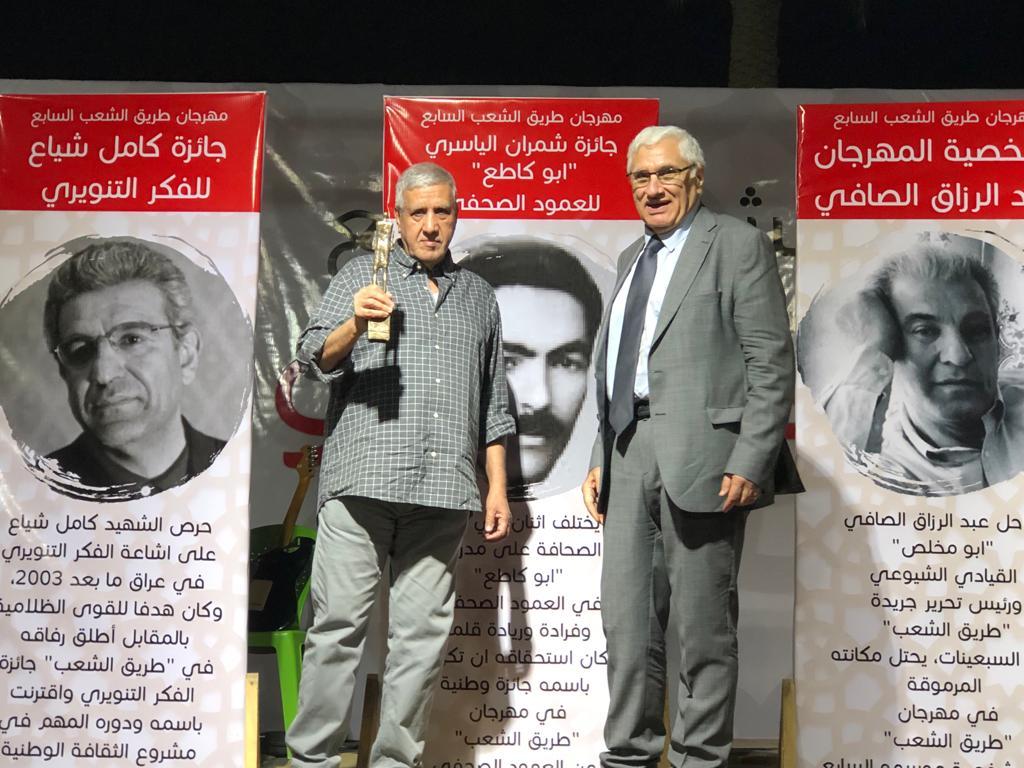 تلقى رئيس التحرير التنفيذي لصحيفة (المدى) علي حسين، اليوم الجمعة، جائزة (شمران الياسري) للعمود الصحفي في مهرجان "طريق الشعب" للصحافة الذي ينظمه الحزب الشيوعي العراقي.