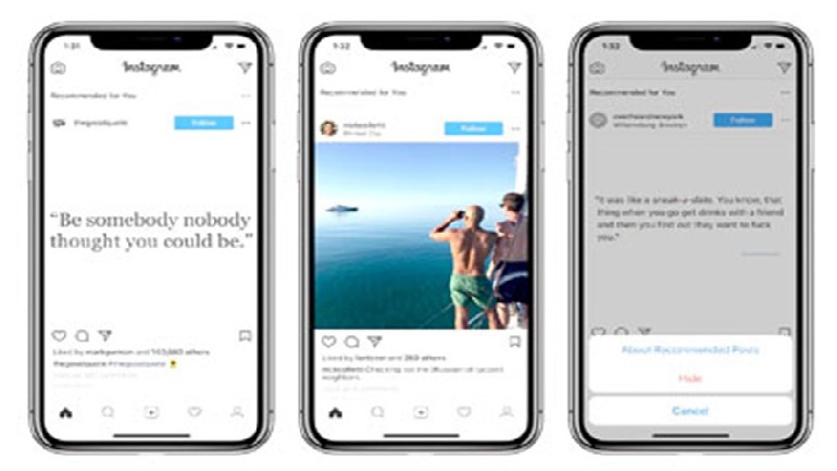 بدأ تطبيق "إنستغرام" بإظهار منشورات "موصى بها" (recommended ) للمستخدمين. وتعمل الميزة على اقتراح صور ومقاطع فيديو بناءً على ما يتابعه المستخدمون وما يُعجبون به، وما تُعجب به الحسابات التي يتابعونها.