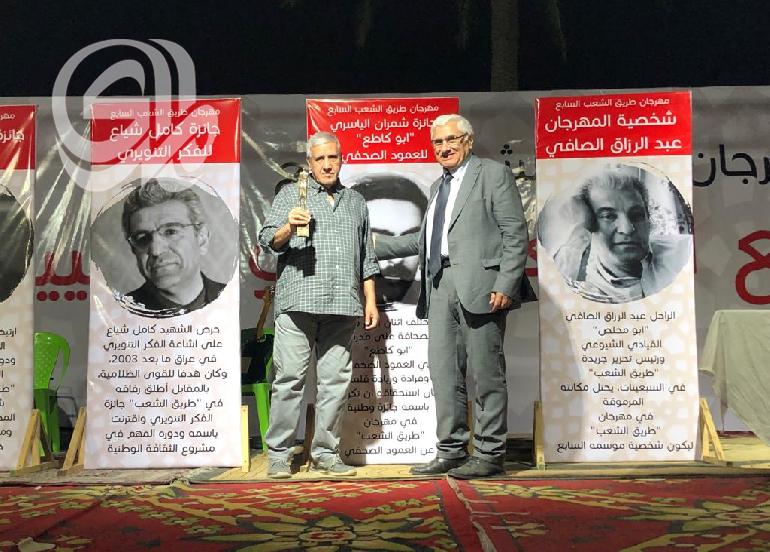 تلقى رئيس التحرير التنفيذي لصحيفة (المدى) علي حسين، اليوم الجمعة، جائزة (شمران الياسري) للعمود الصحفي في مهرجان "طريق الشعب" للصحافة الذي ينظمه الحزب الشيوعي العراقي.