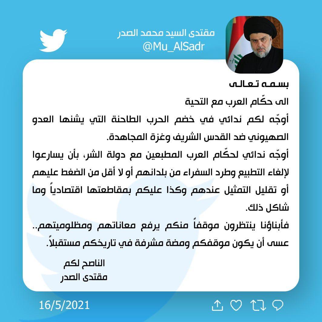 ودعا الصدر في تغريدة له على "تويتر"، الى الغاء التطبيع وطرد السفراء من بلادهم.