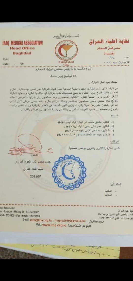 جريدة المدى > اخبار وتقارير > نقابة الأطباء ترشح 4 أسماء لوزارة الصحة (وثيقة)