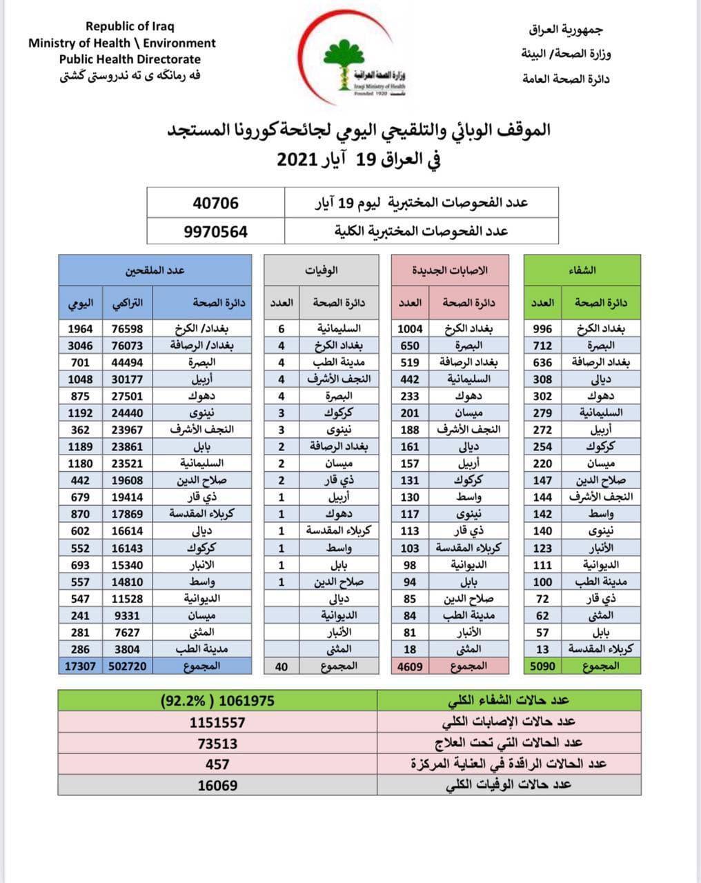 وقالت الوزارة في بيان تلقت (المدى) نسخة منه، إن "الكوادر الطبية سجلت 4609 إصابات جديدة خلال الـ24 ساعة الماضية، فيما تماثل 5090 مصاباً إلى الشفاء، وقابل ذلك وفاة 40 مصاباً خلال المدة المذكورة".