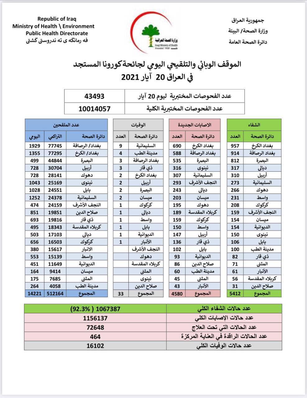 جريدة المدى > اخر الاخبار > الصحة تعلن الموقف الوبائي اليومي لجائحة كورونا