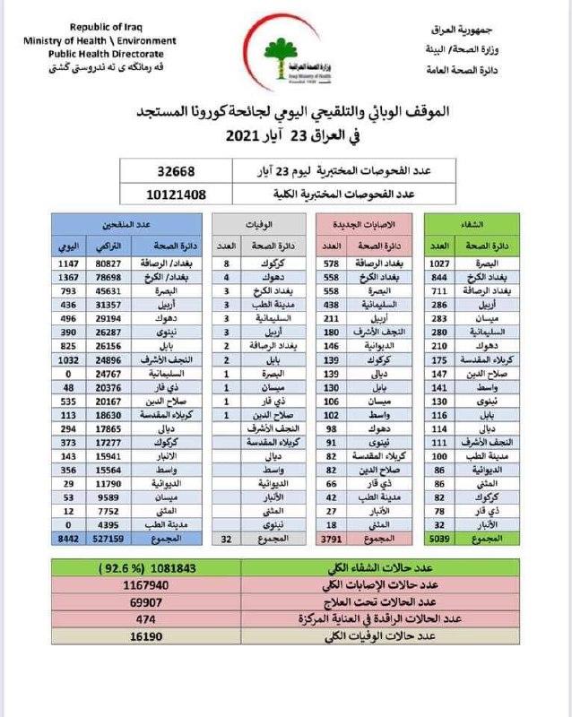 وقالت الوزارة في بيان تلقت (المدى) نسخة منه، إن "الكوادر الصحية سجلت خلال الـ24 ساعة الماضية 3791 إصابة جديدة بفيروس كورونا، فيما تماثل 5039 مصاباً إلى الشفاء، وقابل ذلك وفاة 32 مصاباً خلال المدة المذكورة".