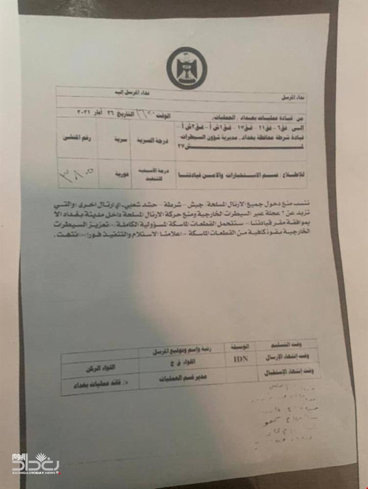 جريدة المدى > اخبار وتقارير > بالوثيقة.. عمليات بغداد توجه بشأن حركة الأرتال العسكرية