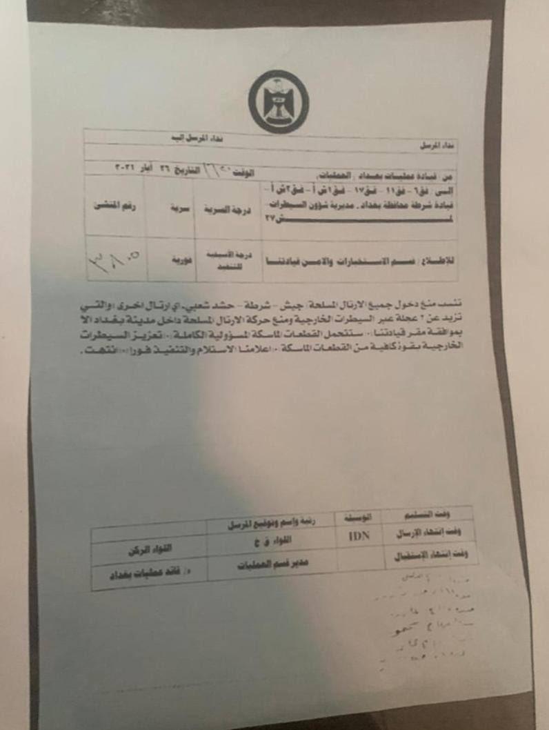 وبحسب وثيقة صادرة من القيادة، اطلعت (المدى) على نسخة منها، "يمنع دخول الأرتال المسلحة من الجيش والشرطة والحشد الشعبي و أي ارتال أخرى التي تزيد عن عجلتين عبر السيطرات الخارجية، ويمنع حركة الارتال المسلحة داخل مدينة بغداد الا بموافقة مقر قيادتنا".