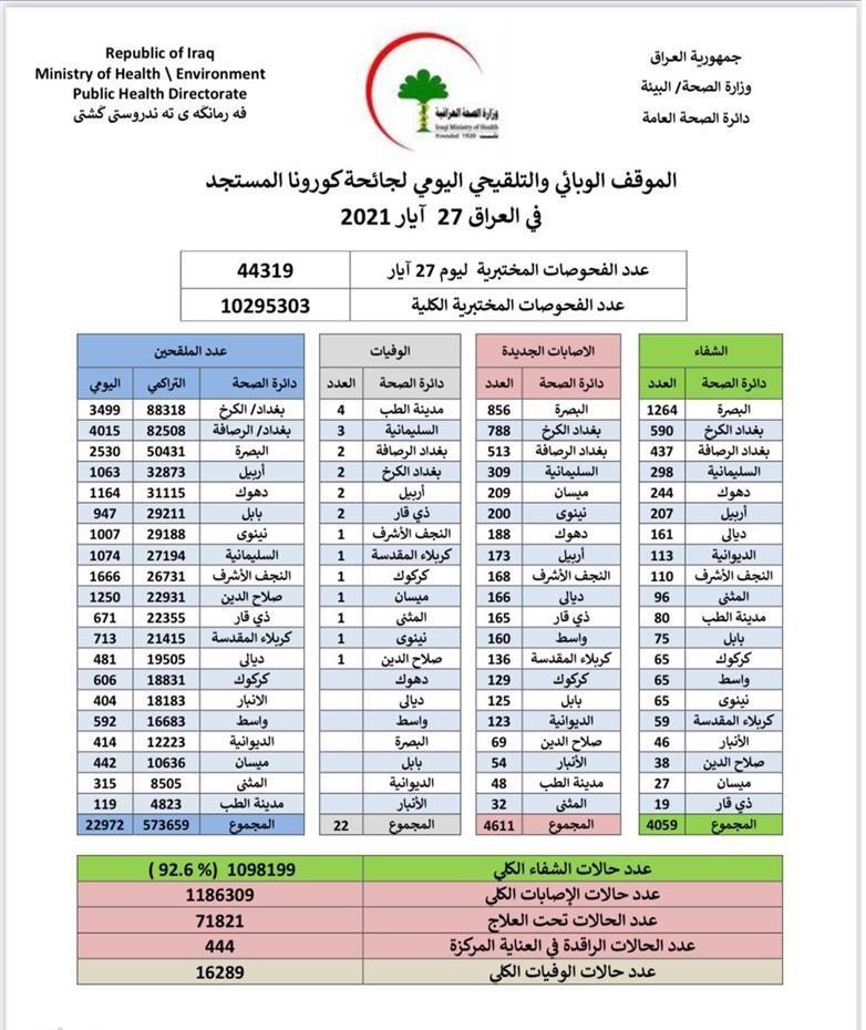 وأضاف البيان، أن "حالات الوفاة الجديدة بكورونا بلغت 22 حالة في عموم محافظات البلاد"، لافتا إلى أن "الأشخاص الذين تلقوا اللقاحات المضادة لكورونا خلال يوم واحد بلغوا 22972 شخصا".