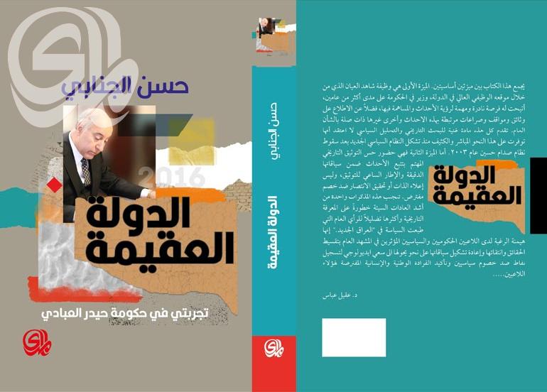 صدر حديثا عن دار المدى كتاب "الدولة العقيمة" للدكتور حسن الجنابي ويروي فيه تجربته في حكومة حيدر العبادي التي تولى فيها وزارة الموارد المائية، والكتاب كما جاء في تقديمه يجمع بين التدوين اليومي في السياسة الى الانطباع الشخصي حول الصيغة الممكنة للسلطة ونوع ممثليها، وقد اتيحت للمؤلف فرصة نادرة ومهمة لرؤية الاحداث والمساهمة فيها، فضلا عن الاطلاع على وثائق ومواقف وصراعات مرتبطة بهذه الاحداث واخرى غيرها ذات صلة بالشأن العام. وتقدم مادة الكتاب مادة غنية للبحث التاريخي والتحليل السياسي.