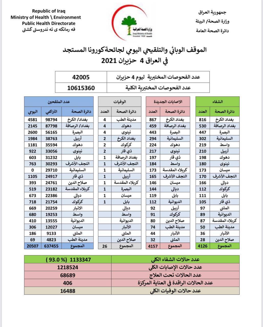 وذكر بيان للوزارة، تلقت (المدى) نسخة منه، إن "الكوادر الصحية سجلت في عموم المحافظات العراقية 4157 إصابة جديدة بفيروس كورونا، فيما تماثل 4126 مصاباً إلى الشفاء، وقابل ذلك وفاة 26 مصاباً خلال المدة المذكورة".
