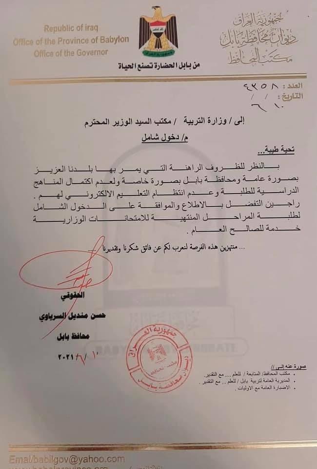 قدم محافظ بابل حسن منديل، اليوم، طلباً الى وزارة التربية للسماح بالدخول الشامل.