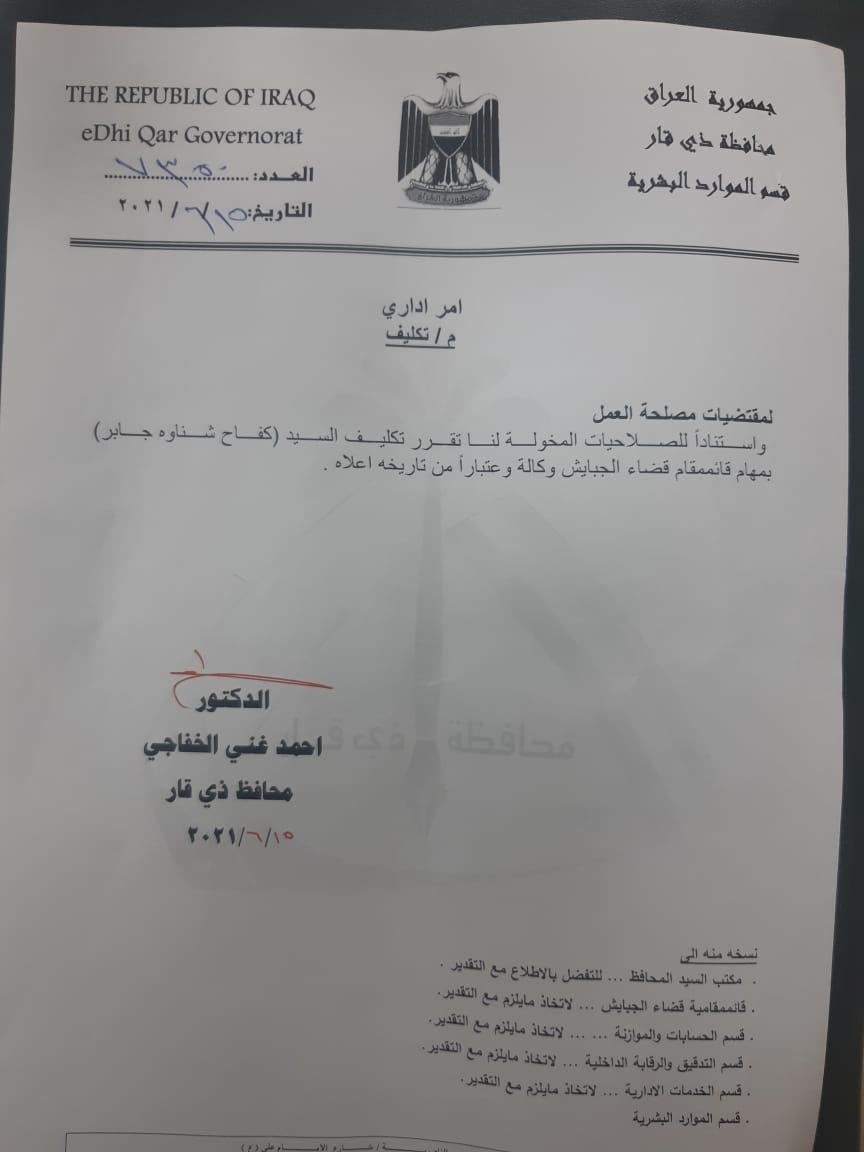 كلفت الحكومة المحلية في محافظة ذي قار اليوم، قائممقام جديد لقضاء الجايش.