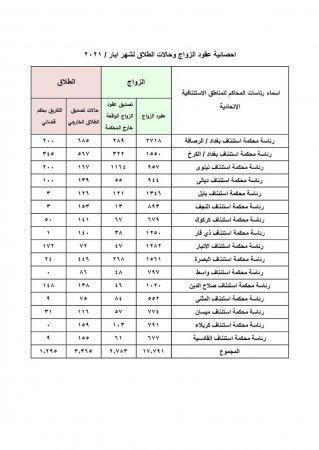 نشر مجلس القضاء الاعلى، اليوم الاربعاء، إحصائية بحالات الزواج والطلاق لشهر آيار الماضي.