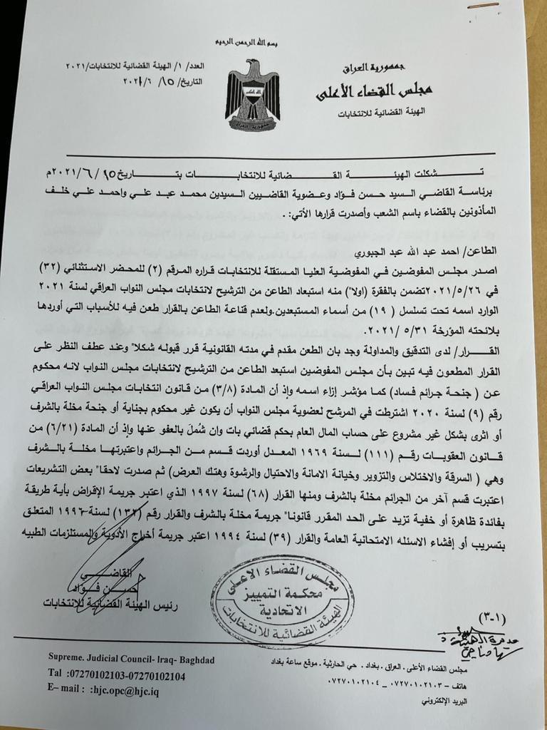 وقال الجبوري، في بيانه تلقت (المدى) نسخة منه، إن "(وَقُلْ جَاءَ الْحَقُّ وَزَهَقَ الْبَاطِلُۚ إِنَّ الْبَاطِلَ كَانَ زَهُوقًا).. القضاء الـــعـــادل قـــال قولــــــه الحـــــــــــق، شكرا للهيئة القضائية ومفوضية الانتخابات لا نصافهما جمهور الحزب وأهله عندما انتصرت للحق وتسامت عن الضغوط السياسية".