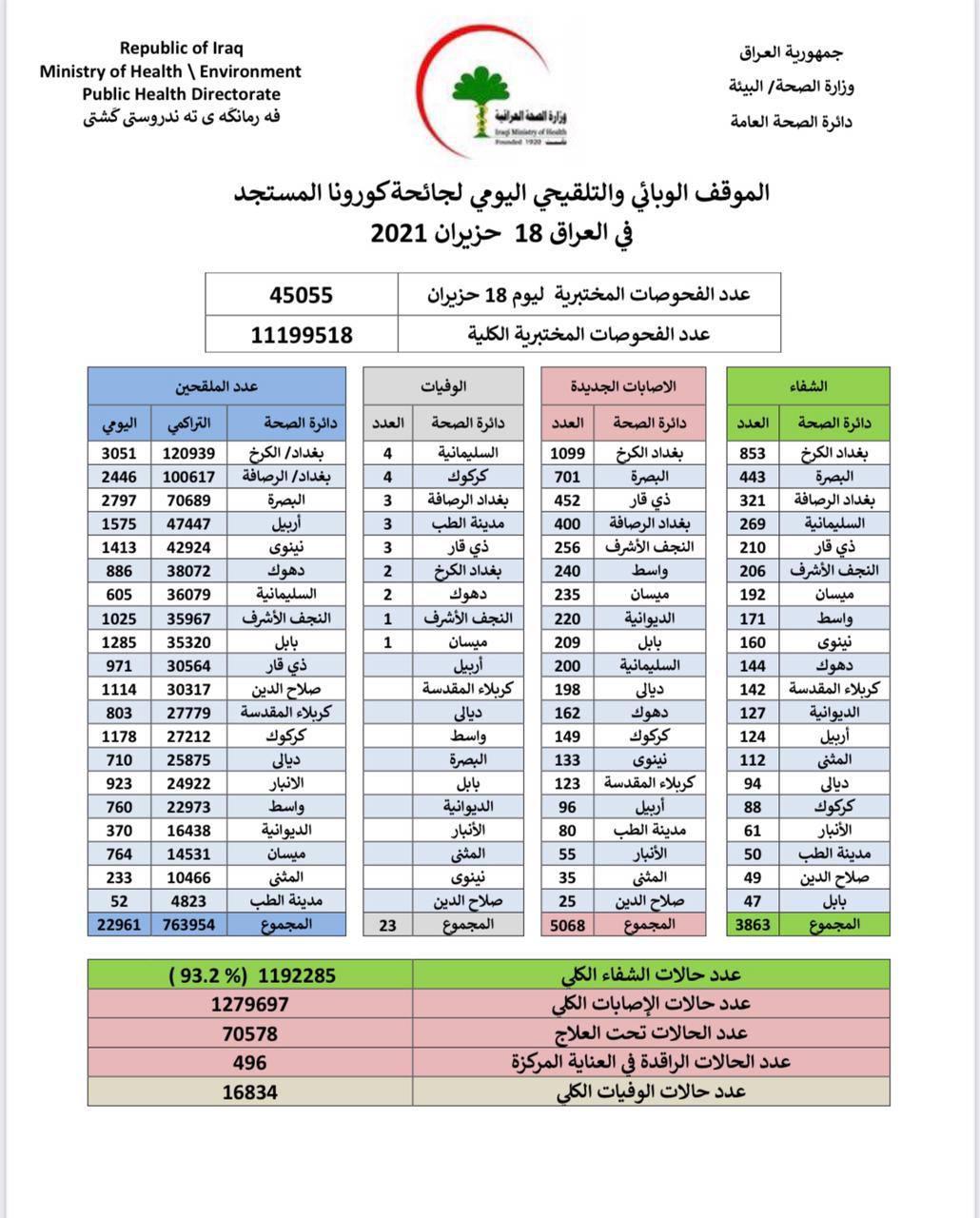 جريدة المدى > اخبار وتقارير > الموقف الوبائي: 5068 إصابة جديدة 3863 حالة شفاء