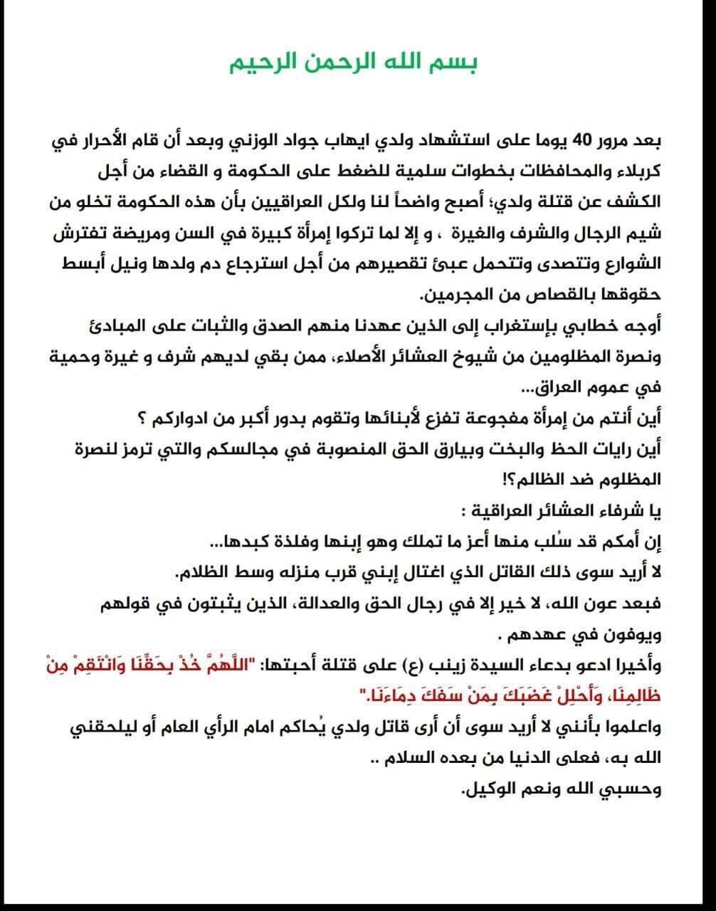 وختمت البيان، "وأخيرا ادعو بدعاء السيدة زينب (ع) على قتلة أحبتها، اللَّهُمَّ خُذْ بِحَقِّنَا وَانْتَقِمْ مِنْ ظَالِمِنَا، وَأَحْلِلْ غَضَبَكَ بِمَنْ سَفَكَ دِمَاءَنَا، واعلموا بأنني لا أريد سوى أن أرى قاتل ولدي يُحاكم امام الرأي العام أو ليلحقني الله به، فعلى الدنيا من بعده السلام، وحسبي الله ونعم الوكيل.