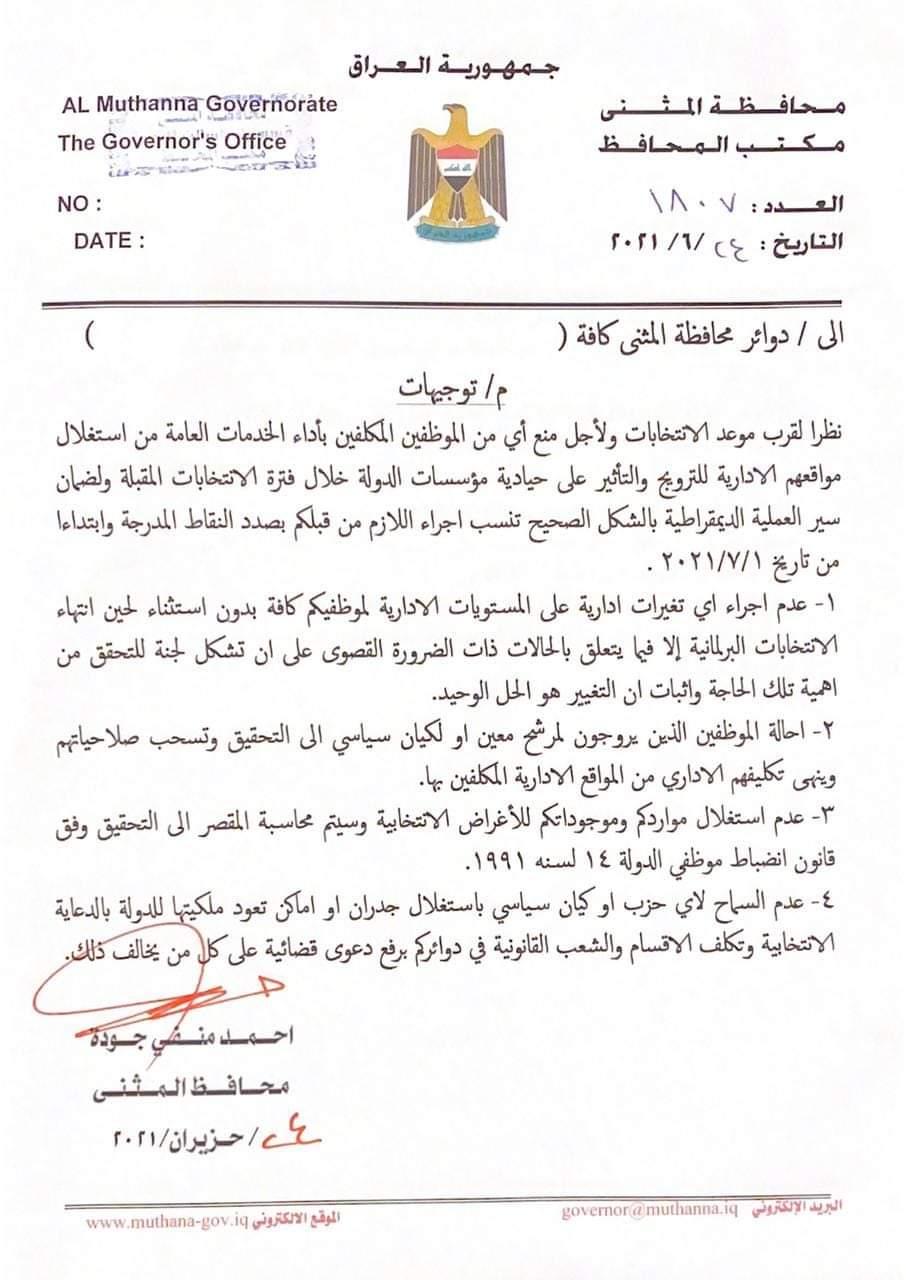 وجه محافظ المثنى أحمد منفي، اليوم السبت، كتابًا إلى دوائر المحافظة تضمن حزمة توجيهات تتعلق بالدعاية الانتخابية.