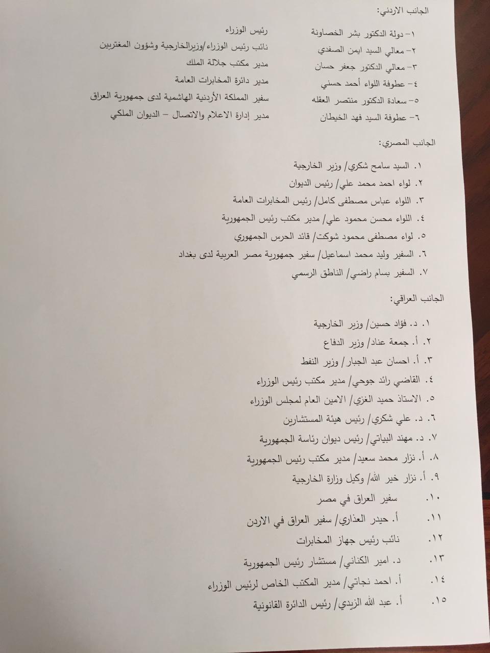 كشفت وثيقة، اليوم الاحد، عن أسماء الشخصيات المشاركة في القمة الثلاثية بين العراق ومصر والأردن في بغداد.