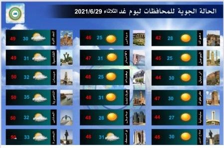 توقعت هيئة الانواء الجوية والرصد الزلزالي، اليوم الاثنين، ارتفاع درجات الحرارة في أربع محافظات عراقية إلى نصف درجة الغليان (50 درجة مئوية).