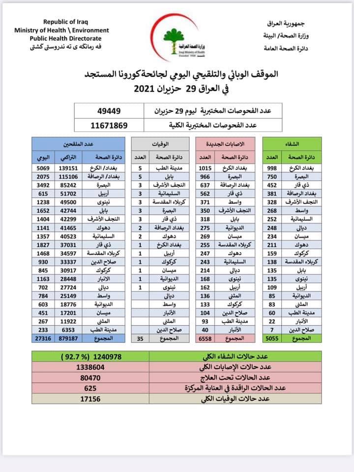 الموقف الوبائي والتلقيحي اليومي لجائحة كورونا في العراق ليوم الثلاثاء الموافق ٢٩ حزيران ٢٠٢١.