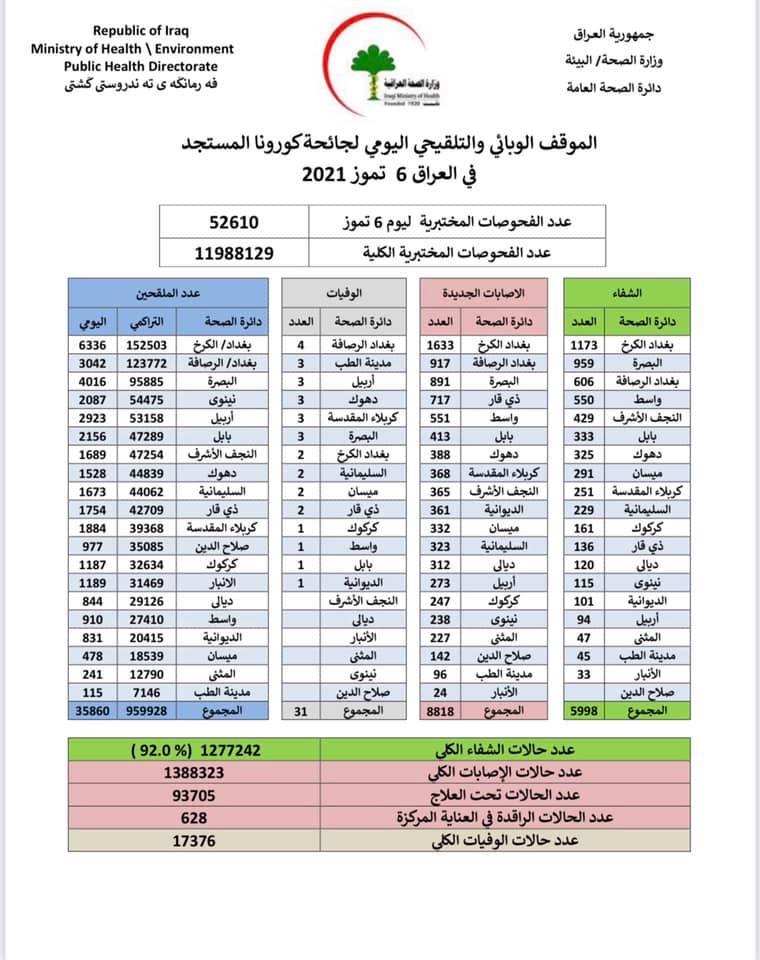 وأظهر الموقف الوبائي تسجيل 8818 حالة اصابة جديدة، فضلا عن تسجيل اعلى حصيلة تلقيح بلغت اكثر من 35 الف شخص.