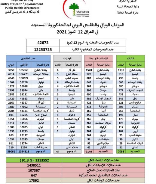 واظهر الموقف الوبائي تسجيل 9149 اصابة جديدة، مقابل 7098 حالة شفاء، وتلقى أكثر من 39 الف شخص لقاح كورونا خلال يوم واحد.
