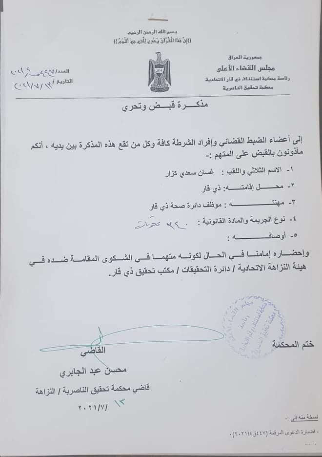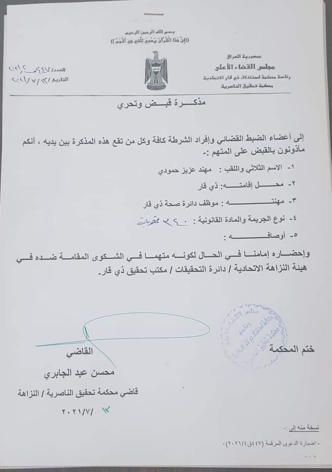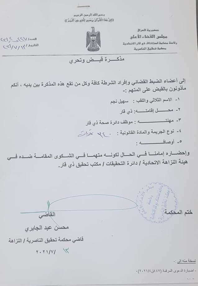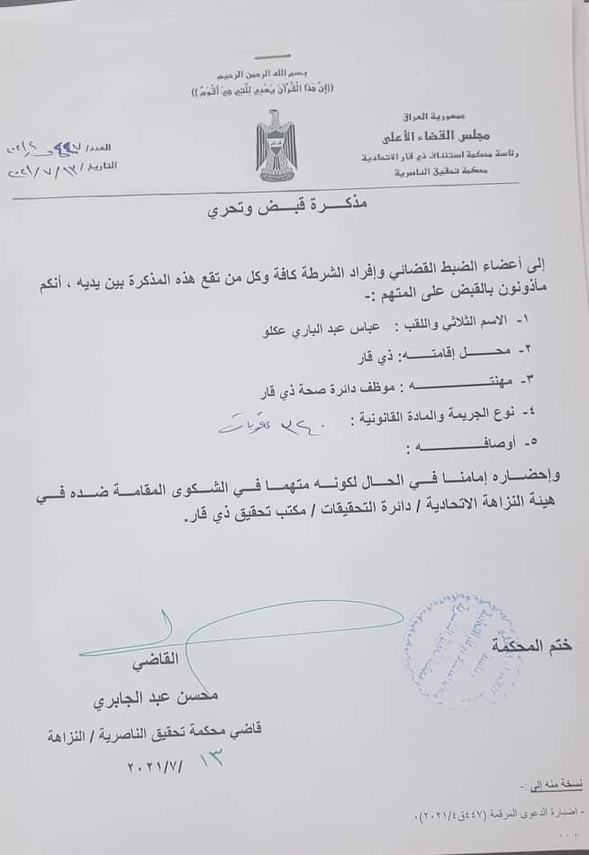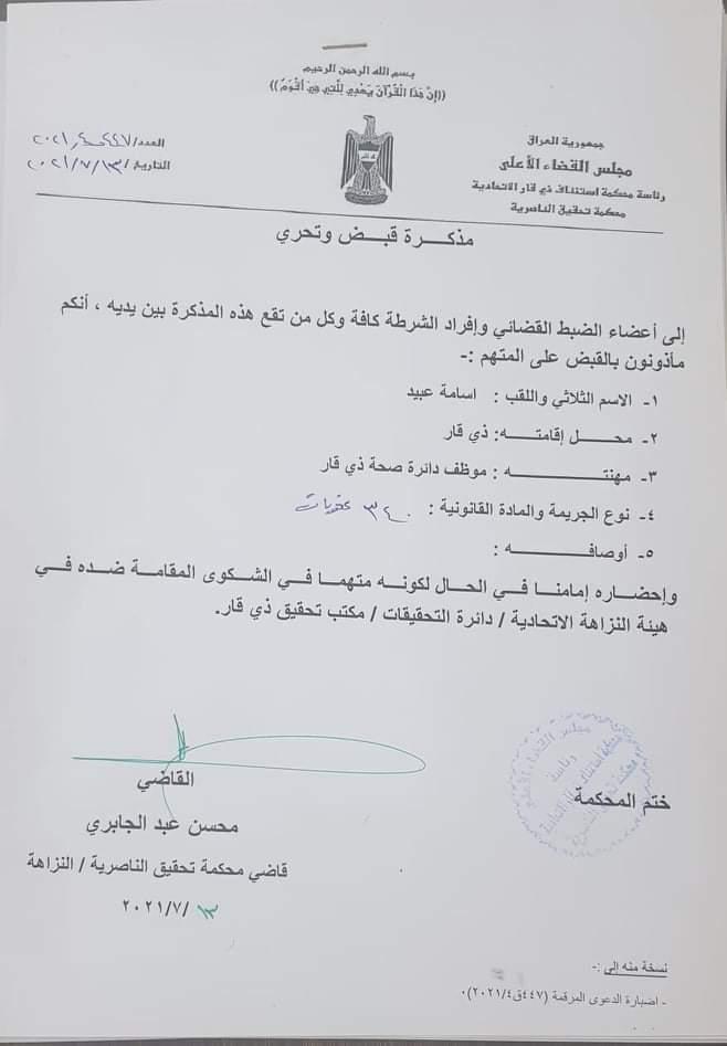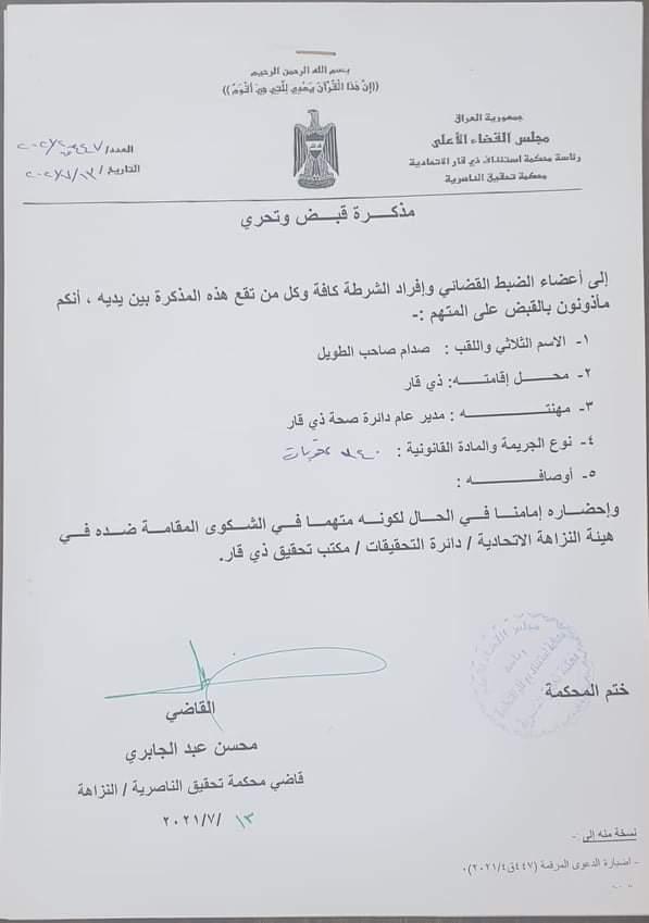حصلت المدى، اليوم الثلاثاء، على مذكرات القبض الصادرة بحق 13 شخصًا من صحة ذي قار، على خلفية فاجعة حريق مركز عزل كورونا في مستشفى الحسين.