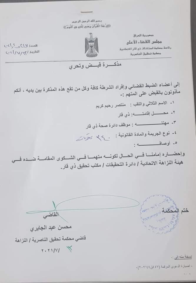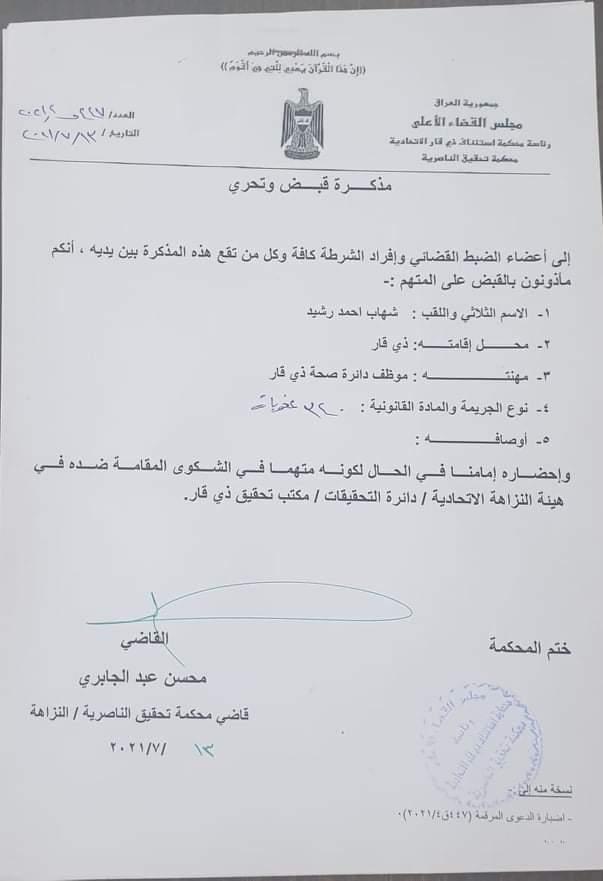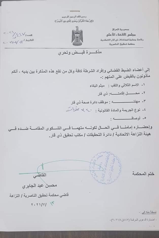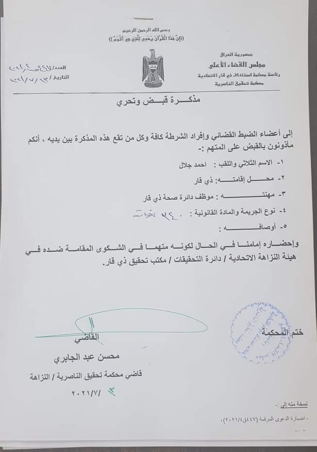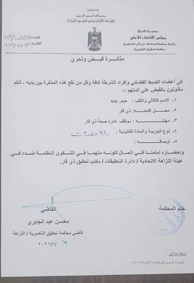 حصلت المدى، اليوم الثلاثاء، على مذكرات القبض الصادرة بحق 13 شخصًا من صحة ذي قار، على خلفية فاجعة حريق مركز عزل كورونا في مستشفى الحسين.