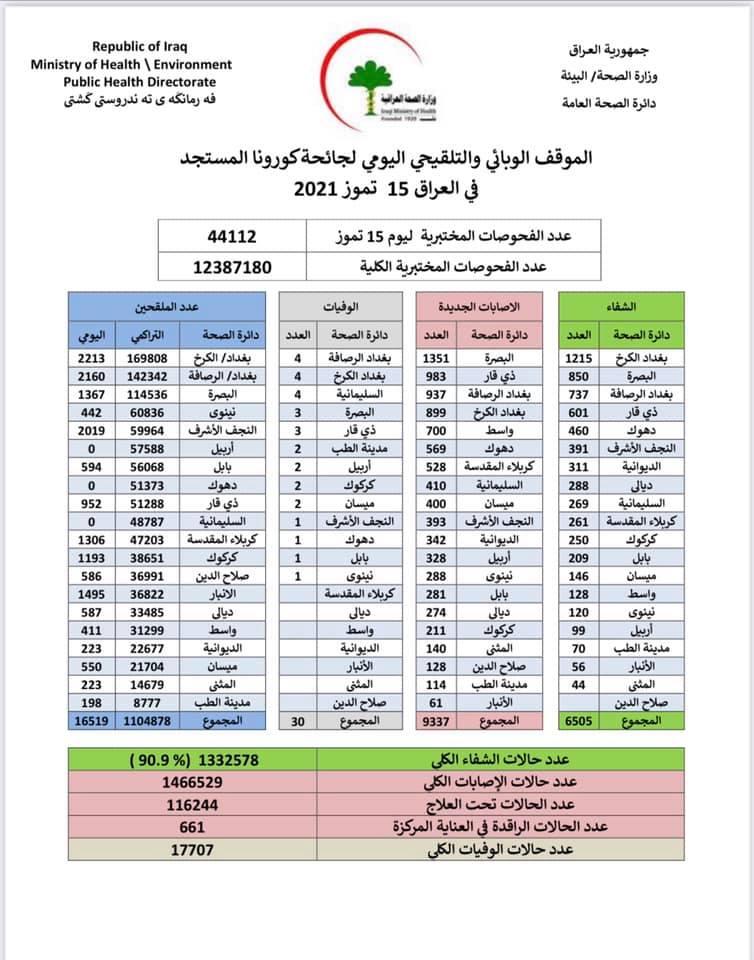 سجلت وزارة الصحة اليوم الخميس، 9337 اصابة جديدة بكورونا مقابل 6505 حالة شفاء.