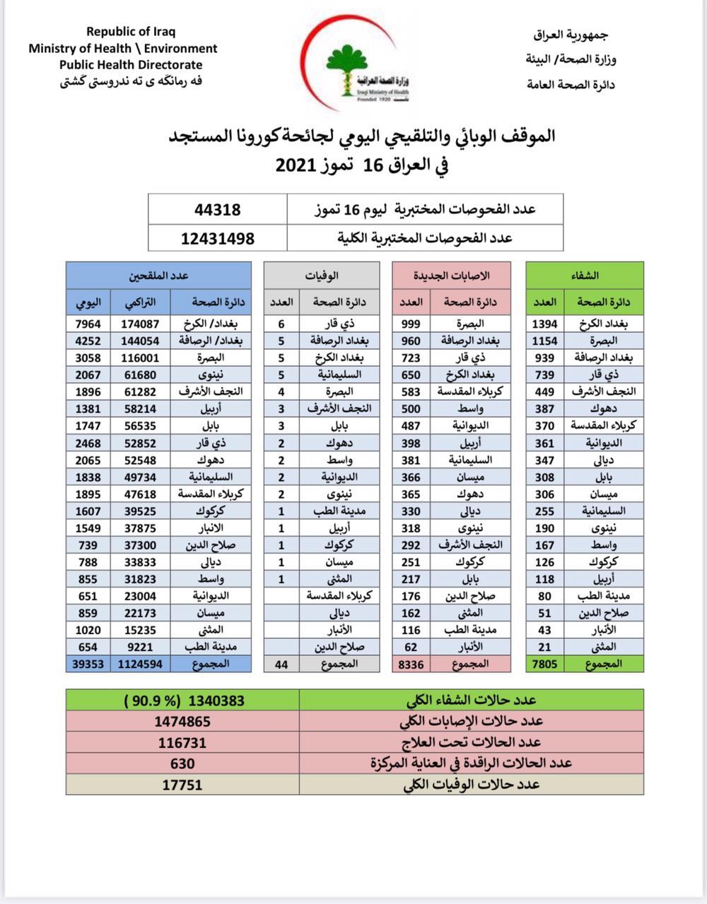 واظهر الموقف الوبائي تسجيل 8336 إصابة فقط انخفاضا من نطاق الـ9 الاف اصابة التي استمر العراق بتسجيلها خلال الايام القليلة الماضية.