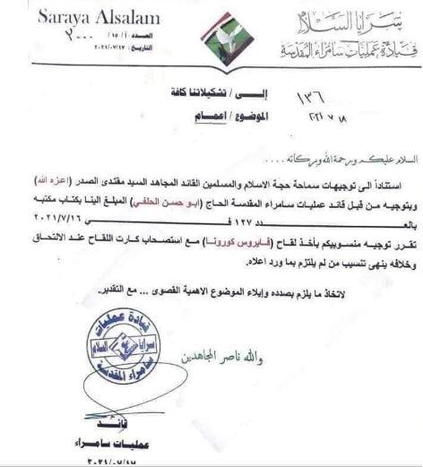 وجهت قيادة عمليات سامراء لسرايا السلام، اليوم الاثنين، كافة تشكيلاتها بتوجيه منتسبيها لتلقي لقاح كورونا، واصطحاب كارت التلقيح عند الالتحاق، فيما قررت انهاء تنسيب من لايحمل بطاقة لقاح كورونا.