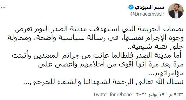 وقال العبودي في تغريدة تابعتها (المدى)، إن "بصمات الجريمة التي استهدفت مدينة الصدر اليوم تعرض وجوه الإجرام نفسها، في رسالة سياسية واضحة، ومحاولة خلق فتنة شيعية".