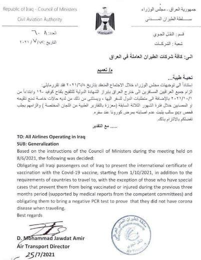 وجهت سلطة الطيران المدني اليوم الاحد شركات السفر كافة بإلزام الراغبين بالسفر من العراق، إظهار وثائق تثبت تلقيهم لقاح كورونا، ابتداء من 1 تشرين الاول المقبل، فيما يستثنى الاشخاص غير مشمولين بتلقي اللقاح ممن لديهم حالات خاصة.