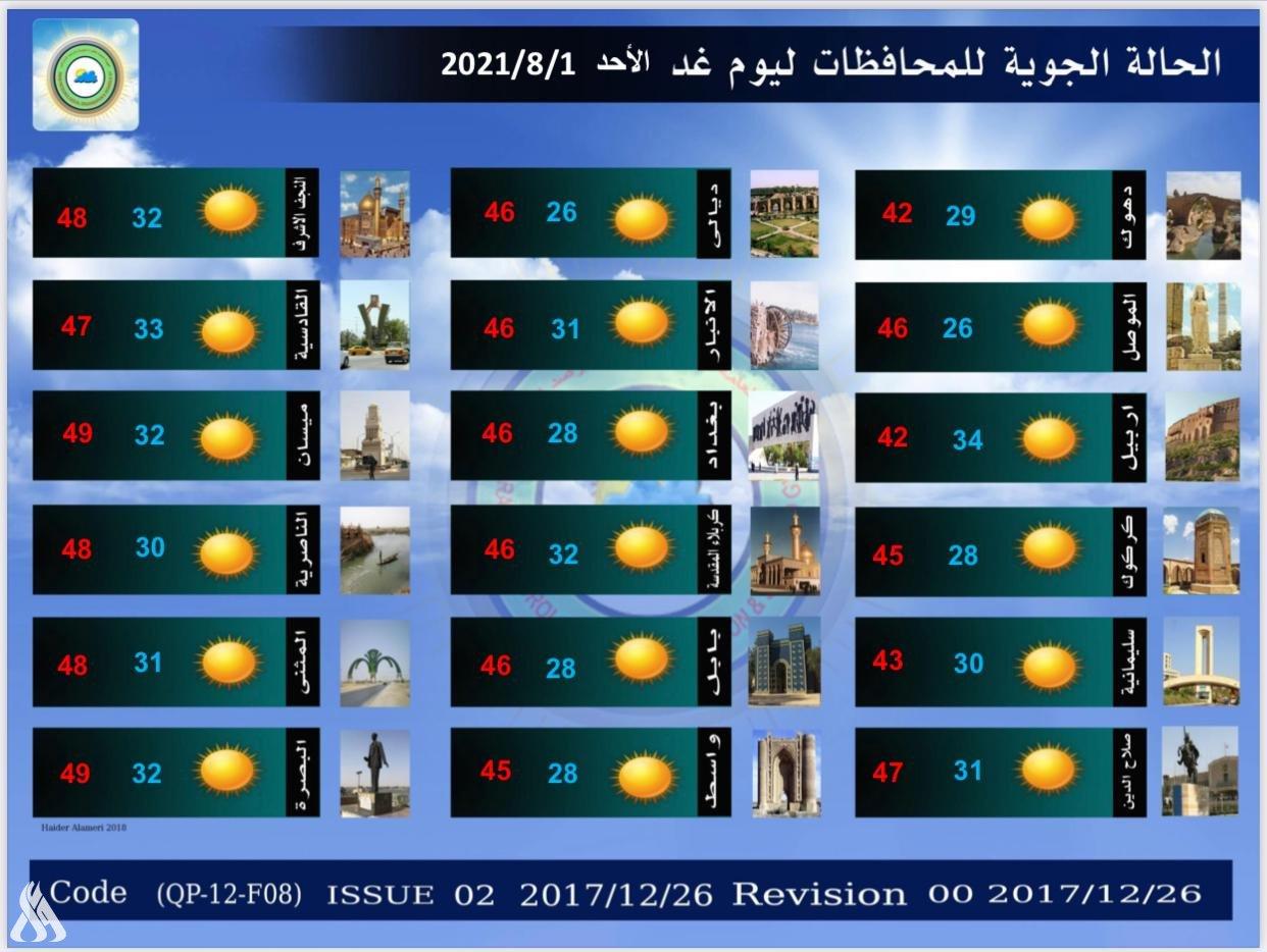 وذكر بيان للهيئة اطلعت عليه "المدى" أن "الطقس في المناطق الشمالية ليوم السبت سيكون صحوا الى غائم جزئي، ودرجات الحرارة مقاربة لليوم السابق، بينما سيكون الطقس في المناطق الوسطى والجنوبية صحوا حارا ودرجات الحرارة مقاربة لليوم السابق ودرجة الحرارة في بغداد 46 درجة مئوية فيما سجلت محافظات البصرة وميسان 47 درجة مئوية".