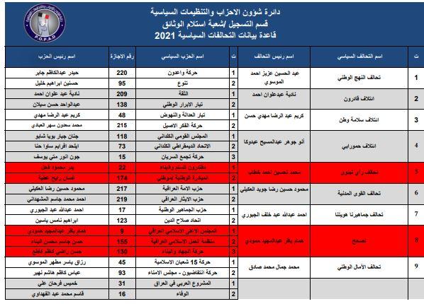 أعلنت دائرة شؤون الأحزاب والتنظيمات السياسية، اليوم السبت، قائمة بـ24 تحالفًا سياسيًا من المفترض انها ستخوض الانتخابات، فيما غابت بعض الكتل عن القائمة أبرزها "الكتلة الصدرية".