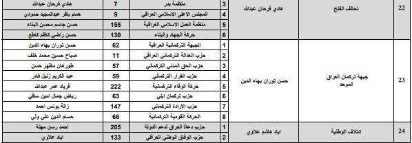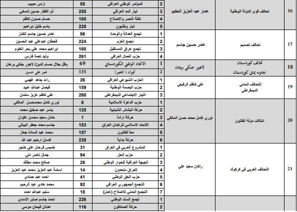 وبينت الغلاي أن "القائمة تضم التحالفات فقط، وهي المكونة من عدة أحزاب وكتل"، مشيرة إلى أن "الكتلة الصدرية وبعض الكتل والأحزاب الكردية الأخرى غابت عن قائمة التحالفات لأنها سجلت ككتل منفردة ولم تتحالف مع كتل أخرى".