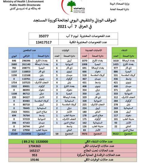 أعلنت وزارة الصحة اليوم السبت، تسجيل 7973 اصابة جديدة بفيروس كورونا، في انخفاض كبير ورقم لم تسجله الوزارة منذ أسابيع.