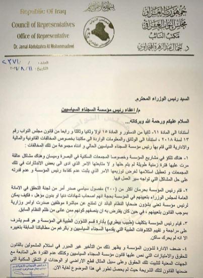 وقال المحمداوي، بحسب وثيقة صادرة عن مكتبه، واطلعت عليها (المدى) إنه "استناداً الى الوثائق والمعلومات الواردة إلينا بخصوص المخالفات القانونية والمالية والإدارية التي قام بها رئيس مؤسسة السجناء السياسيين الحالي والتي تضر عملية تقديم الخدمات لشريحة السجناء السياسيين".