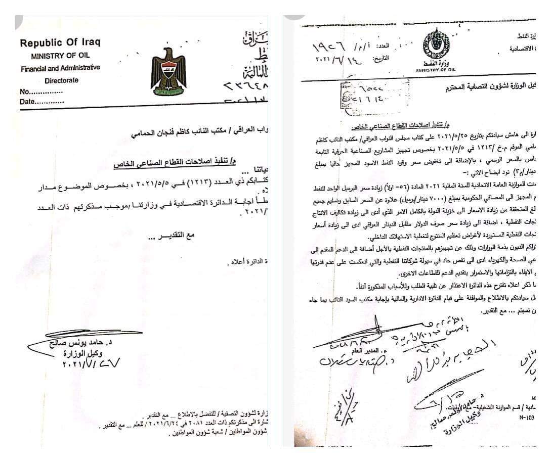 وعبّر النائب عن "حزنه وأسفه للطريقة التي تعاملت بها وزارة النفط في تأكيد تخليها عن دعم القطاع الصناعي الخاص وذلك بتعمدها ارسال الرد الذي جاءها على لسان احد اقسامها من دون ان تكلف نفسها مشقة اعداد كتاب مفصل يليق بالتعامل مع أكبر القطاعات الانتاجية في هذا البلد المتناقض مع نفسه والمتقاطع مع ابسط القواعد الاقتصادية" بحسب تعبير الحمامي الذي نشر وثيقة تكشف رد وزارة النفط على طلبه.