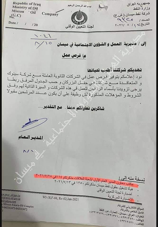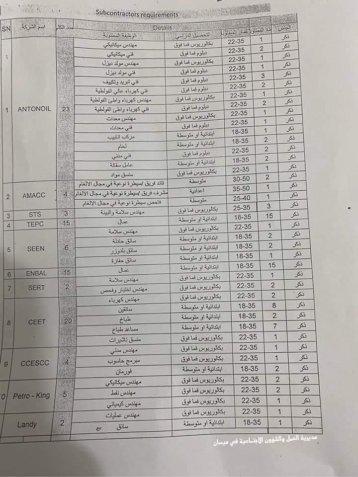 اعلنت مديرية العمل والشؤون الاجتماعية في محافظة ميسان عن توفر فرص عمل في الشركات الثانوية العاملة مع شركة سينوك والمتعاقدة مع شركة نفط ميسان.