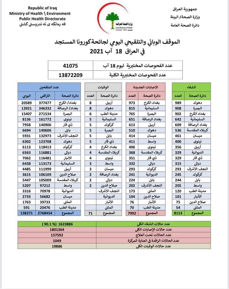 وأضاف البيان، أن "حالات الوفاة الجديدة بكورونا بلغت 71 حالة في عموم محافظات البلاد"، لافتا إلى أن "الاشخاص الذين تلقوا اللقاح خلال 24 ساعة بلغ عددهم 138271".