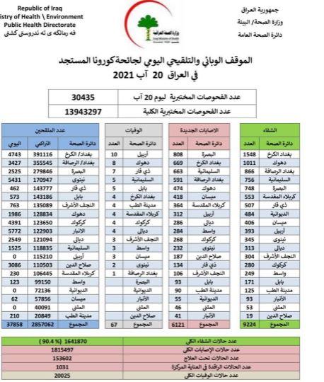 واظهر الموقف الوبائي المعلن والذي اطلعت عليه (المدى) تسجيل 6121 اصابة فضلا عن 9224 حالة شفاء و67 حالة وفاة، فيما انخفض التطعيم الى 37 ألف و858 شخص.