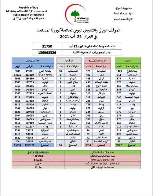 واظهر الموقف الوبائي تسجيل 9647 حالة شفاء، و74 حالة وفاة، فيما اظهر الموقف التلقيحي تطعيم نحو 96 الف شخص.