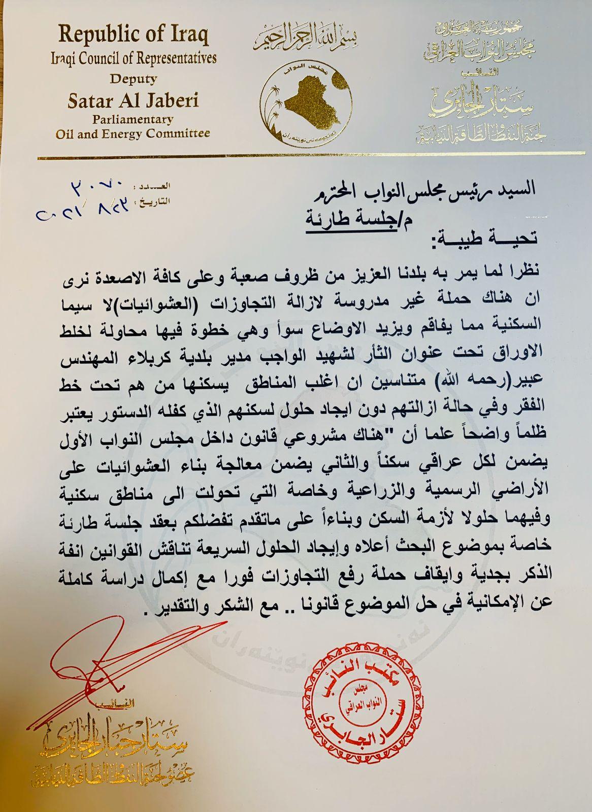 جريدة المدى > اخبار وتقارير > وثيقة: جمع تواقيع لعقد جلسة طارئة بشأن ازالة التجاوزات