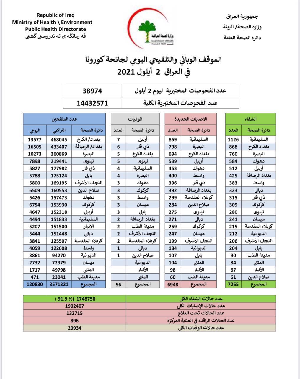 واظهر الموقف الوبائي تسجيل 7265 حالة شفاء فضلا عن 56 حالة وفاة، بالاضافة الى تطعيم اكثر من 120 الف شخص.