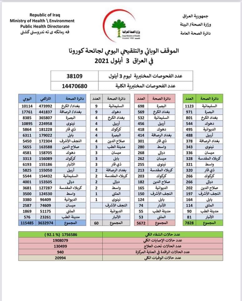 أعلنت وزارة الصحة اليوم الجمعة تسجيل 5672 اصابة جديدة بفيروس كورونا مقابل 7828 حالة شفاء، فضلا عن 60 حالة وفاة، فيما كان عدد الملقحين اكثر من 115 الف شخص.