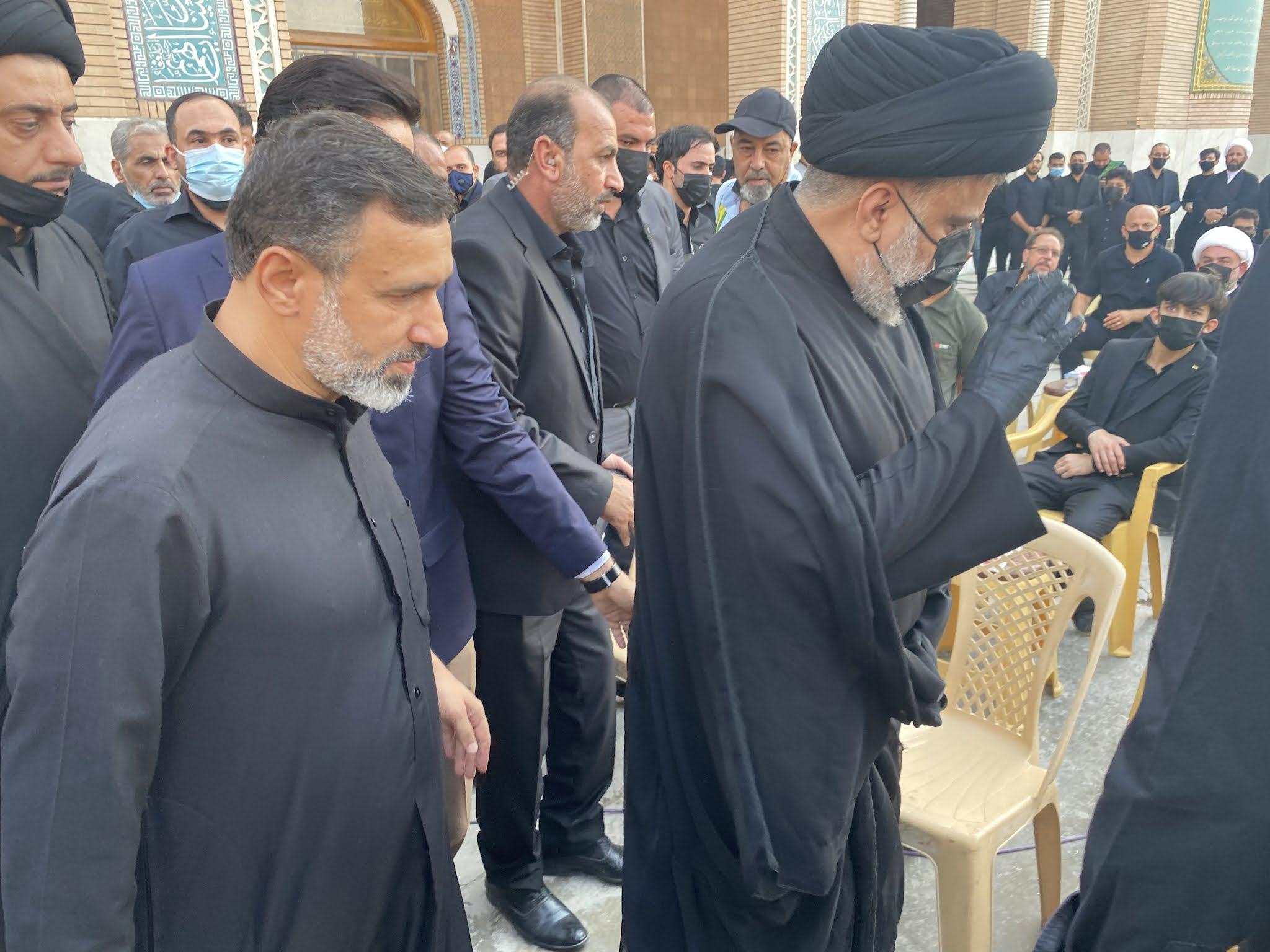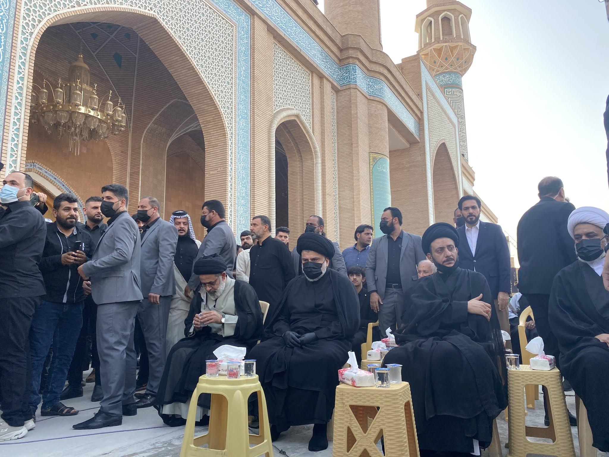 وصل زعيم التيار الصدري مقتدى الصدر الى مسجد السهلة لتقديم العزاء برحيل المرجع محمد سعيد الحكيم.
