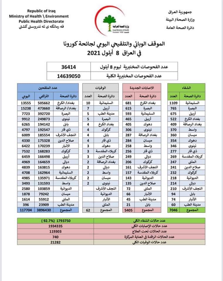 وأضاف البيان، أن "حالات الوفاة الجديدة بكورونا بلغت 62 حالة في عموم محافظات البلاد"، لافتا إلى أن "الاشخاص الذين تلقوا اللقاح خلال 24 ساعة بلغ عددهم 117704".