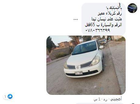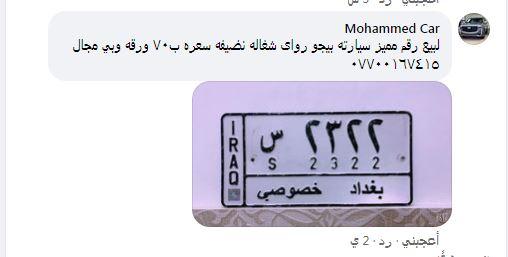 بالاضافة إلى ذلك، قام أحد الأشخاص بعرض رقم عجلته الرباعي المميز للبيع بـ7 الاف دولار (أي اكثر من 10 ملايين دينار عراقي) مع عجلة نوع روى، والمفارقة أنه قام بعرض صورة للرقم وذكر العجلة بشكل هامشي، مايوحي إلى انها "مجانية"!.