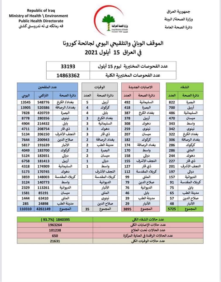وأضاف البيان، أن "حالات الوفاة الجديدة بكورونا بلغت 35 حالة في عموم محافظات البلاد"، لافتا إلى أن "الاشخاص الذين تلقوا اللقاح خلال 24 ساعة بلغ عددهم 110310".