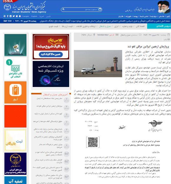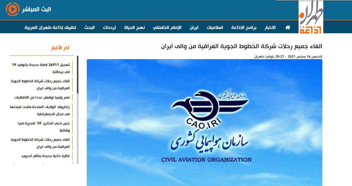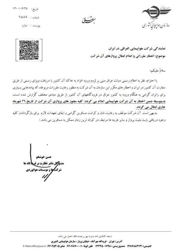 واضافت المنظمة انها "تعلن بهذا القرار ان كافة الرحلات المتعلقة بشركة الخطوط الجوية العراقية (من والى ايران) اعتبارا من يوم 17 ايلول، اصبحت لاغية"، فيما ألزمت المنظمة في بيانها شركة الخطوط الجوية العراقية بإعادة قيمة التذاكر المباعة وغيرها من الرسوم ذات الصلة الى اصحابها، على وجه العجالة.